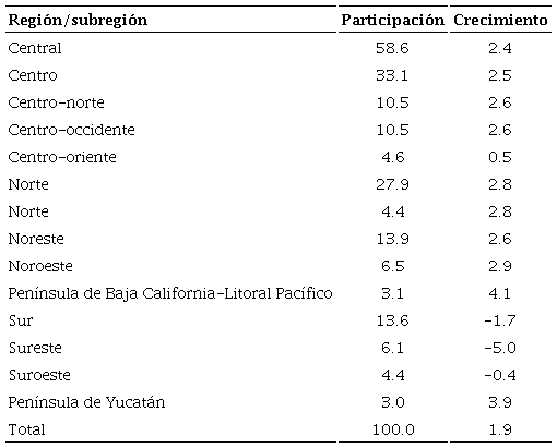 Las actividades productivas de la economía mexicana se concentran en la región central, específicamente en la subregión centro. Contrasta un peso considerable de la región norte con una participación baja de la región sur. La subregión conformada por Coahuila, Nuevo León y Tamaulipas es la que muestra una mayor participación en la región norte. En la región sur, el mayor peso lo ostentan los estados petroleros de Campeche y Tabasco (véase el Cuadro 1).