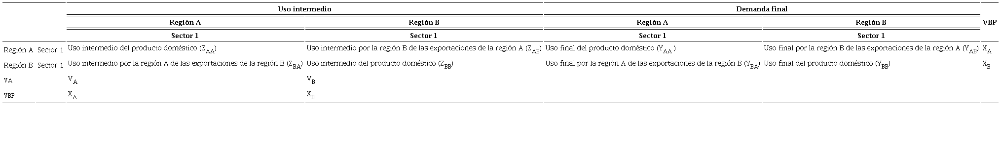 Hasta el momento se ha presentado un modelo de insumo-producto unirregional, sin embargo, en esta investigación se utiliza uno interregional. La diferencia es que las exportaciones se desagregan de acuerdo con el sector-región receptor y las importaciones, conforme al sector-región de donde provienen.