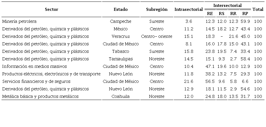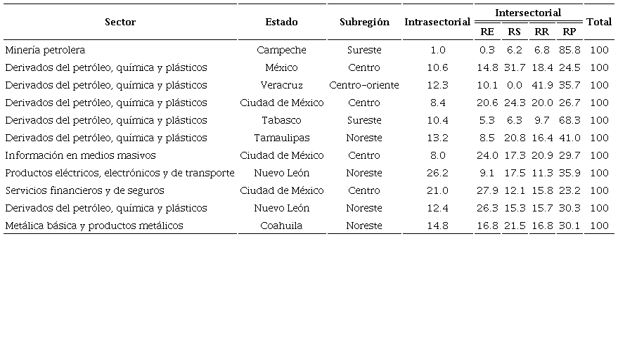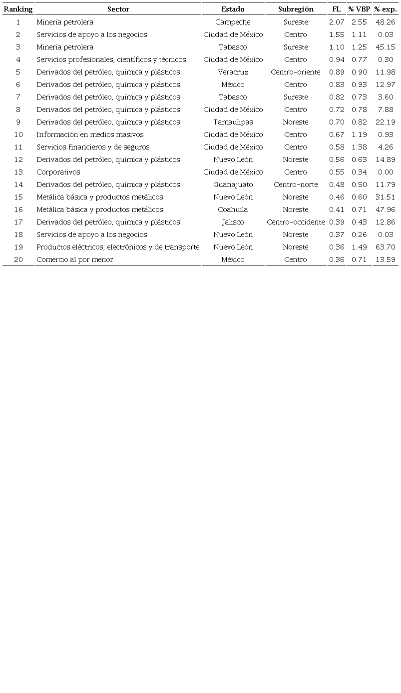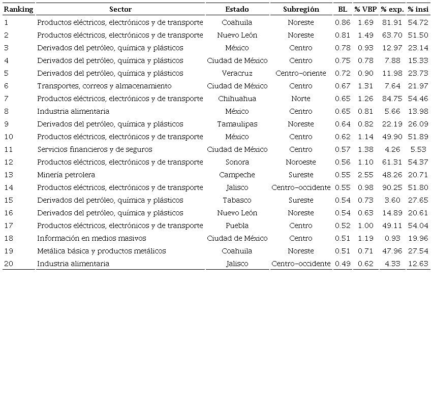 El top 20 muestra una concentración a escalas sectorial, estatal y subregional. Once sectores se encuentran localizados en la región central, siete en la región norte y solamente dos en la región sur. Además, únicamente 12 estados y siete subregiones participan en el top. Las subregiones sin presencia en el top 20 son: península de Baja California-Litoral Pacífico en la región norte; península de Yucatán y suroeste en la región sur, y centro-norte en la región central.