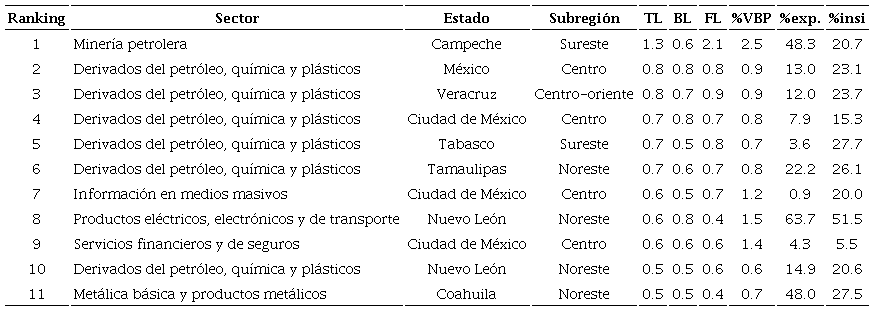 En las últimas posiciones del ranking de sectores-estado clave destacan la información en medios masivos y los servicios financieros y de seguros localizados en la Ciudad de México, ambos con mayor importancia como proveedores de servicios que como demandantes de insumos. También destaca la industria metalúrgica de Coahuila, estrechamente relacionada con la minería no petrolera y la industria automotriz.