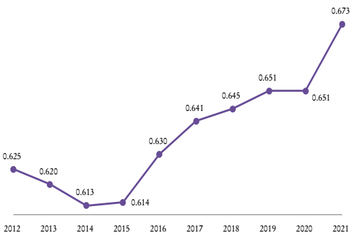 En virtud de este panorama de degradación prolongada de las condiciones de trabajo en Brasil ―al que se suma la reducción de los recursos fiscales para el mantenimiento de la oferta de bienes públicos, como salud, educación y vivienda―, la desigualdad social, que estaba reduciéndose con éxito ya hace más de una década, volvió a crecer durante los años de profundización de la agenda neoliberal, esto es, desde 2015. Como revela la trayectoria del índice de Gini, calculado sobre el ingreso per cápita del trabajo habitual (Gráfica 1), desde 2014 (el más bajo de la serie) hasta 2019 hubo un crecimiento expresivo de la desigualdad, lo cual volvió a acelerarse entre 2020 y 2021.