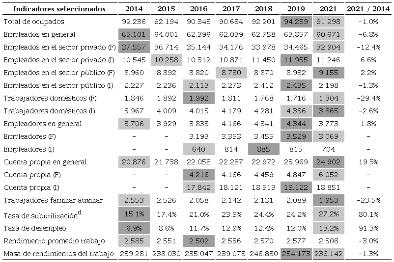 Acerca de la dinámica de los rendimientos de trabajo, lo que se comprende con nitidez en el Cuadro 2 es que en 2021 el promedio calculado todavía estaba en un nivel de 3% por debajo de aquel que se registraba en 2014 y tan sólo ligeramente más arriba (+0.2%) del rendimiento medio de 2016, el más bajo de la serie, asociado con el peor momento de la recesión. Por consiguiente, al sumar los dos factores ―aumento del desempleo y caída del ingreso del trabajo―, la masa salarial también se contrajo en el periodo (-1.3%), atenuada en parte por el aumento de la tasa de participación y el crecimiento vegetativo de la fuerza de trabajo en este lapso.
