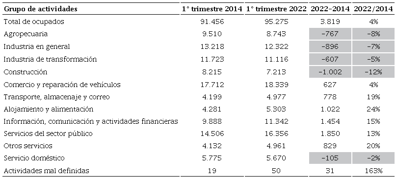 Asimismo, en lo que respecta a las transformaciones recientes del mercado de trabajo brasileño, cabe destacar algunos otros números presentados en el Cuadro 3, que se refieren a la distribución de los ocupados según las principales agrupaciones de actividad económica del país. De modo general, al comparar el primer trimestre de 2014 con el mismo trimestre de 2022, puede notarse una contracción de los empleos en las agrupaciones de actividad más tradicionales, como en la agropecuaria (-767 000), la industria en general (-896 000), la industria de transformación (-607 000) y la construcción civil (-1 000 000). Por otro lado, principalmente en las actividades relacionadas con los servicios, fueron registrados crecimientos sustantivos, sobre todo en actividades de alojamiento y alimentación (+24%), de transporte y almacenaje (+19%) y de servicios de información, comunicación y actividades financieras (+15%). O sea, se revela aquí también la fase precoz y acelerada de la desindustrialización brasileña y de la contracción del mercado de trabajo en sectores mejor estructurados, en los cuales, en general, se concentran oportunidades de empleo cualitativamente superiores (más estables, con mejores salarios y con mayor acceso a derechos sociales y laborales). Por otro lado, un crecimiento del número de puestos de trabajo se observa especialmente en las actividades de servicios vinculadas con el comercio de bienes de consumo no duraderos y la demanda de las familias (servicios personales), esto es, en sectores de actividad más volátiles, de baja productividad y reducida capacidad de valor agregado, en los cuales en general el trabajo es mal remunerado, los vínculos son frágiles y el acceso a derechos es escaso. Como ejemplo de este avance de los servicios precarios, cabe señalar la importancia creciente de las ocupaciones en las actividades de transporte y almacenamiento, entre las cuales se encuentran los repartidores de mercancías (rappitenderos) y los choferes de pasajeros (tipo Uber), dos categorías cuyo rubro aumentó de forma notable, impulsados por el avance y la diseminación de las plataformas digitales.38