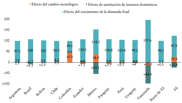 Para el agregado de AL, el efecto del cambio tecnológico aportó 3 puntos porcentuales de incremento en la producción bruta (o 25.9% del aumento total); mientras, el efecto de la sustitución de insumos domésticos fue negativo, al restar 2.7 puntos porcentuales al aumento en la producción bruta (o 23.8% del incremento); asimismo, el cambio asociado con el crecimiento de la demanda final registró un efecto positivo equivalente a 11.3 puntos porcentuales del aumento de la producción bruta (o 97.9% del incremento). De esta manera, al agregar los anteriores efectos se obtiene el aumento total de la producción bruta (11.5%).