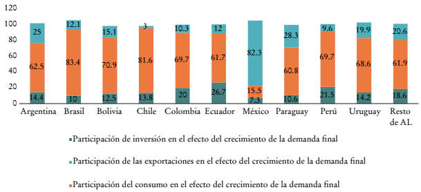El consumo es el principal componente del crecimiento de la demanda final. El valor máximo se ubica en Venezuela (no incluida en la gráfica), con una contribución de 336.3%. En el resto de las economías latinoamericanas el consumo concentra al menos 60% del total del efecto, salvo en México, donde aporta sólo 15.5%. Por otra parte, en promedio, el segundo componente en importancia es la inversión, con 13.8%, la cual alcanza su máxima participación en Ecuador, con 26.7%, y la mínima en Venezuela, con -3.4%. En AL las exportaciones aportan en promedio 13.4% del efecto total del crecimiento de la demanda final; en este componente destaca México, donde las exportaciones tienen una participación de 82.3%, mientras que Venezuela es el caso contrario, con -76.7 por ciento.