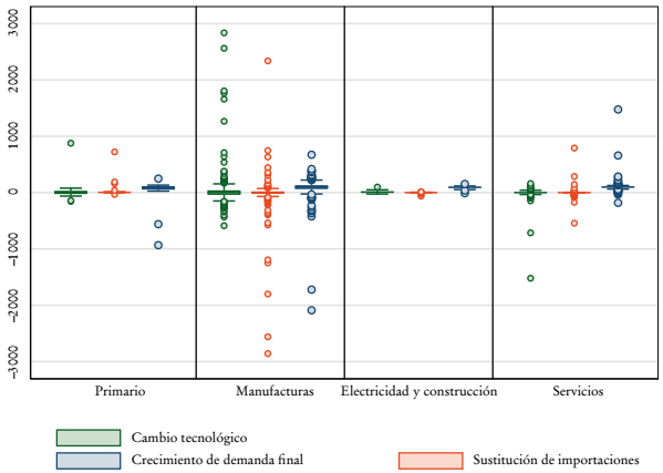 El primer efecto captura el cambio tecnológico. En la metodología empleada los cambios en los coeficientes directos totales de insumo-producto se interpretan como cambios tecnológicos y, como ventaja, distingue cambios en los coeficientes asociados con la sustitución entre insumos nacionales e importados. No obstante, como señalan Magacho et al. (2018) y Rose y Casler (1996), en las descomposiciones estructurales los factores relacionados con los cambios tecnológicos significan modificaciones en los coeficientes de insumo-producto que no necesariamente impactan en el crecimiento tecnológico total, en el sentido de Solow o contabilidad de crecimiento, y sí incluyen de manera amplia cualquier modificación en una técnica estructural como cambio tecnológico, la posibilidad de sustituciones técnicas como respuesta a modificaciones en los precios de los insumos y cambios debidos a los efectos de escala.