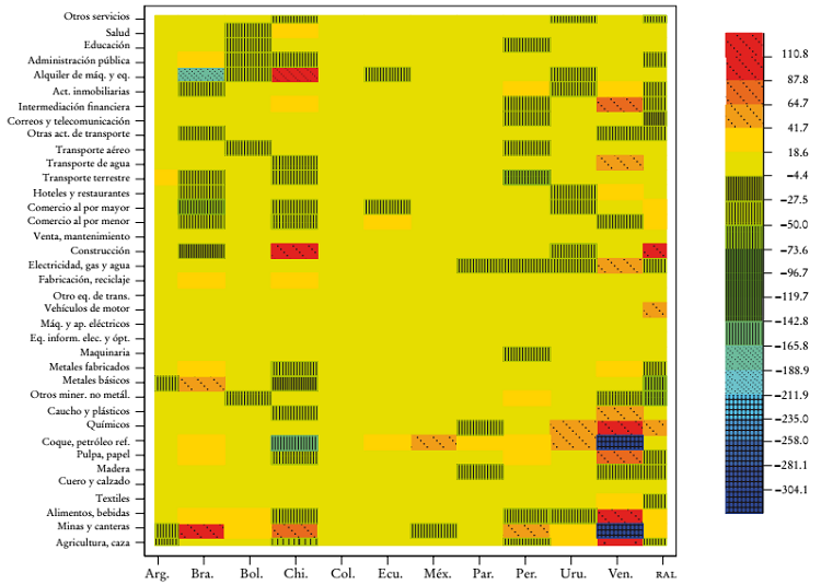 La Gráfica 4 muestra la aportación de cada uno de los sectores al efecto del cambio tecnológico por país. Conforme la contribución de los sectores es mayor, éstos se ubican en un color más cercano al rojo (punteados), mientras las menores aportaciones y las negativas se acercan al color azul (cuadriculados). Por ejemplo, en México predominan las aportaciones positivas en la mayoría de los sectores (color amarillo, textura lisa), pero puede distinguirse que el sector de minas y canteras (tono verde, rayas verticales) es el que tiene la contribución más negativa, mientras que el sector de coque, petróleo refinado y combustible nuclear tiene la contribución más elevada (los datos se pueden consultar en los cuadros del apéndice). Con excepción de México, Colombia y en menor medida Ecuador, se observa que en el resto de las economías latinoamericanas más sectores concentran aportaciones positivas al efecto del cambio tecnológico. En economías como Brasil, Chile y Venezuela también puede identificarse que varios sectores tienen importantes contribuciones en sentido negativo.