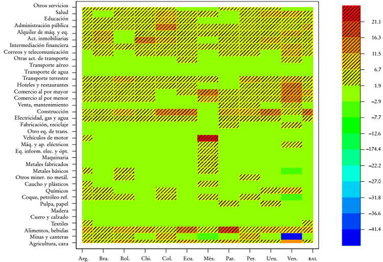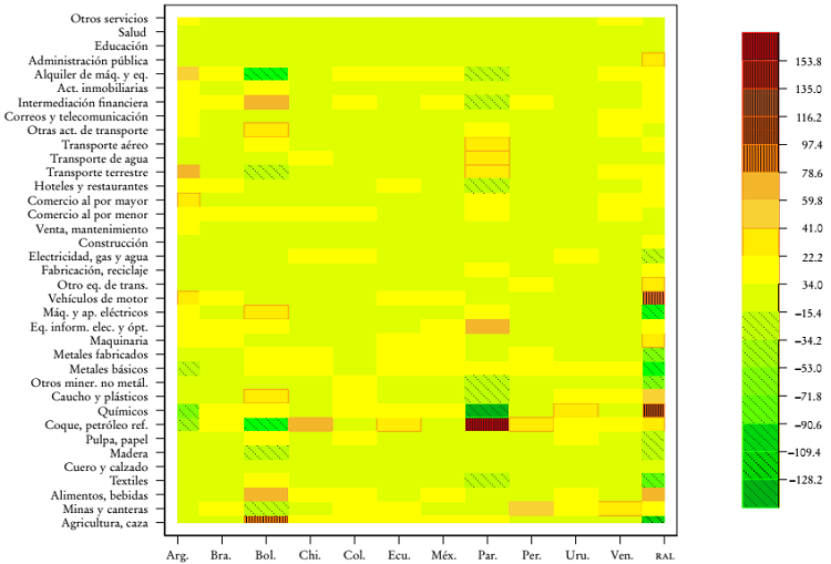 Las matrices insumo-producto presentan en forma matricial el equilibrio sectorial o entre actividades que van de la oferta a la utilización de bienes y servicios de la estructura productiva de una economía. Esta descripción se extiende a las relaciones de sectores o actividades del exterior con los sectores nacionales o domésticos. En este sentido, los efectos analizados también se examinan en términos de las aportaciones que realizan los sectores o las actividades de los países considerados. Las gráficas de calor o heatmap ofrecen una primera impresión de estas contribuciones y en la agenda de investigación se requiere profundizar en el análisis sectorial por economía latinoamericana de los efectos en los que se descompone el cambio en la producción bruta.