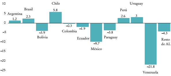Por otra parte, en el resto de las economías consideradas la sustitución de insumos importados tuvo un efecto positivo en el cambio de la producción bruta: Argentina y Bolivia con 0.5%; Paraguay con 0.8%; Perú con 1.3%; Colombia con 3.3%; Chile con 4.3%; Uruguay con 4.8%, y Ecuador con 6.8%. Sin embargo, estas economías en conjunto apenas compensaron en 15 puntos porcentuales el total del cambio negativo asociado con la sustitución de insumos importados en la región. De esta manera, se distinguen dos aspectos de la integración latinoamericana a la producción y el comercio global: un grupo de economías en las que las importaciones y los insumos importados sustituyen producción doméstica, y otro en el que la producción nacional avanza sobre la importada.