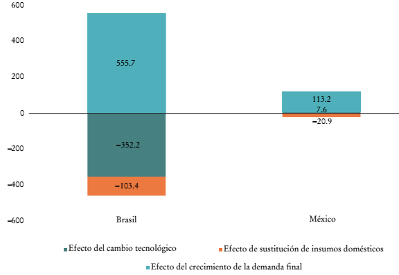 Para el conjunto de países de AL, el incremento de la producción bruta entre 2007 y 2017 fue de 11.5%. Éste se descompuso de la siguiente forma: el efecto del cambio tecnológico aportó 3 puntos porcentuales de aumento en la producción bruta (o 25.9% del incremento total); el efecto de la sustitución de insumos domésticos fue negativo al restar 2.7 puntos porcentuales al incremento en la producción bruta (o 23.8% del mismo), y el cambio asociado con el crecimiento de la demanda final registró un efecto positivo equivalente a 11.3 puntos porcentuales del aumento de la producción bruta (o 97.9% de éste). De esta manera, el incremento de la demanda constituye el principal efecto en el aumento de la producción bruta en AL.