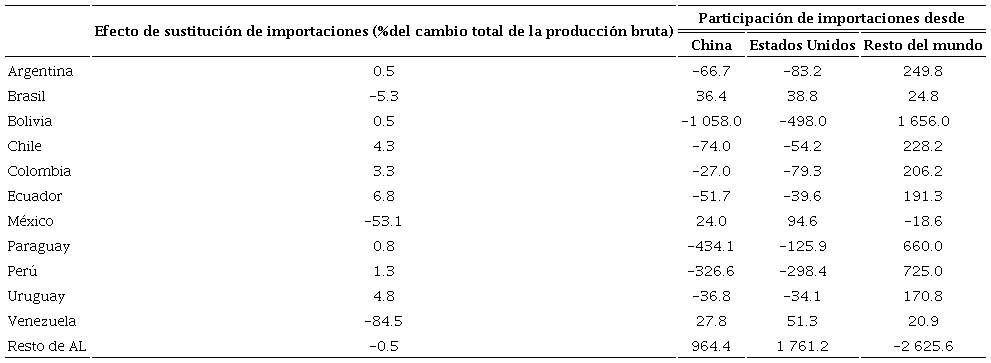 Los países agrupados en el resto de AL también presentan un efecto negativo de la sustitución de importaciones. Ese efecto se explica por las importaciones provenientes de China y los Estados Unidos, y se modera por los efectos positivos de la sustitución de importaciones con otros socios comerciales.