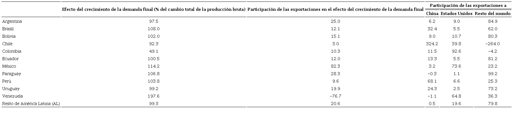 En el agregado de AL las exportaciones tienen un efecto positivo equivalente a 13.4% del efecto del crecimiento de la demanda final. Al desagregar el de las exportaciones por socio comercial, se observa que éste se explica en promedio en 18.9% por las exportaciones a China, en 41.4% por las que van a los Estados Unidos y en 39.7% por las exportaciones al resto del mundo. En todas las economías consideradas, con excepción de Venezuela, las exportaciones tienen un impacto positivo en el cambio en la producción bruta en el periodo de análisis, lo que se presenta en el Cuadro 2.