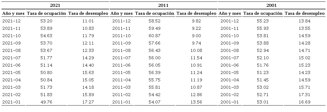 Las cifras de los reportes de sectorización monetaria y financiera del Banco de la República contienen datos brutos, como “el panorama monetario, el panorama bancario y un panorama financiero restringido” (Banco de la República, 2022c). Asimismo, puede hallarse el Catálogo de estadísticas, con una amplia recaudación de cifras clasificadas (Banco de la República, 2022a). En el bloque “Actividad económica, mercado laboral y cuentas financieras” se encuentran las tablas de tasas de ocupación y desempleo, las cuales evidencian que en 2001-2021 la cifra de tasa menor de desempleo corresponde a noviembre de 2015, con 7.27%, y la tasa mayor de desempleo es de mayo de 2020, con 21.38%, luego de la crisis sanitaria de covid-19; esto es sólo semejante a las cifras de desempleo de comienzos del periodo, en enero de 2002, de 17.87 por ciento.