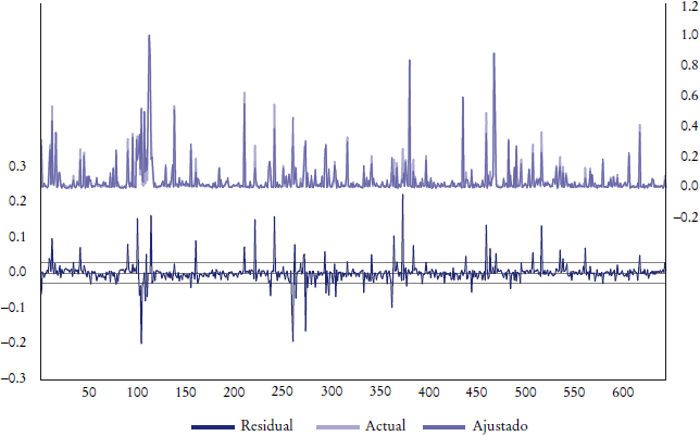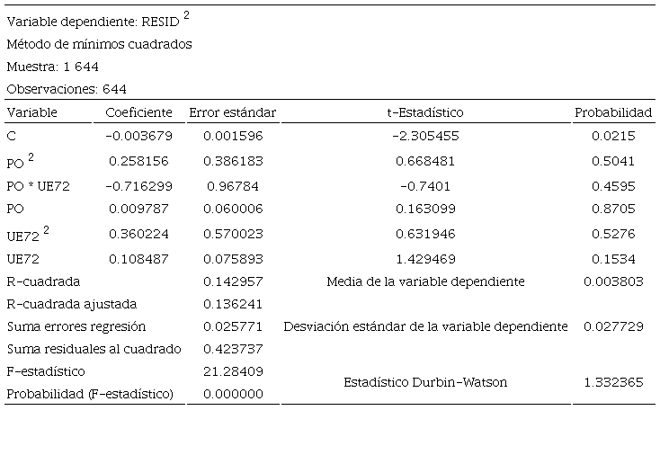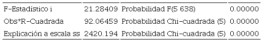 Además, se aplicó la prueba de White para confirmar la existencia de heterocedasticidad. Cabe aclarar que dicha prueba se realiza mediante un análisis de regresión, considerando como variable dependiente los residuos al cuadrado, y como variables independientes el cuadrado de dichas variables y de sus productos cruzados. En el Cuadro 4 se presentan los resultados de la prueba de White, que confirman que el modelo no presenta homocedasticidad, debido a que el p-valor fue menor a 0.05, por lo no que se rechaza la hipótesis nula y, por lo tanto, existe heterocedasticidad.