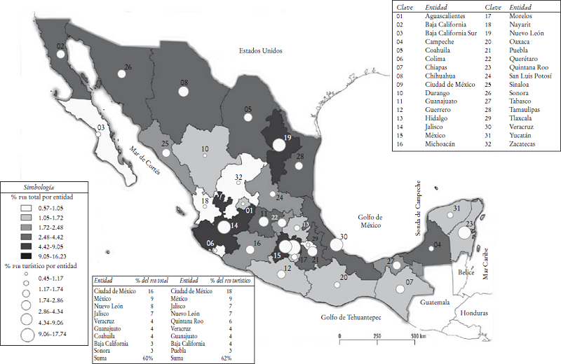 Sin embargo, contar con la Cuenta Satélite de Turismo para México (CSTM) y con la existencia de datos económicos censales desagregados para rama y clase de actividad turística posibilita su estimación. De ahí que el propósito principal de esta investigación sea estimar el PIB turístico (PIBT) por localidad, municipio y entidad federativa de México para 2018 y su distribución espacial a nivel subnacional del país, mediante una concepción teórica espacial de la economía turística y una metodología estadística y econométrica, que precisan los procedimientos y las técnicas empleadas en la medición del PIB turístico en los niveles de desagregación y representación espacial antes mencionados. La investigación se integra de las siguientes partes: I. Antecedentes; II. Revisión de la literatura reciente sobre la estimación del PIB turístico subnacional; III. Propuesta de interpretación de la dimensión espacial de la economía turística; IV. La metodología y sus etapas; V. Resultados de la estimación del PIB turístico por localidad, municipio y entidad federativa para 2018, y VI. Conclusiones y recomendaciones.