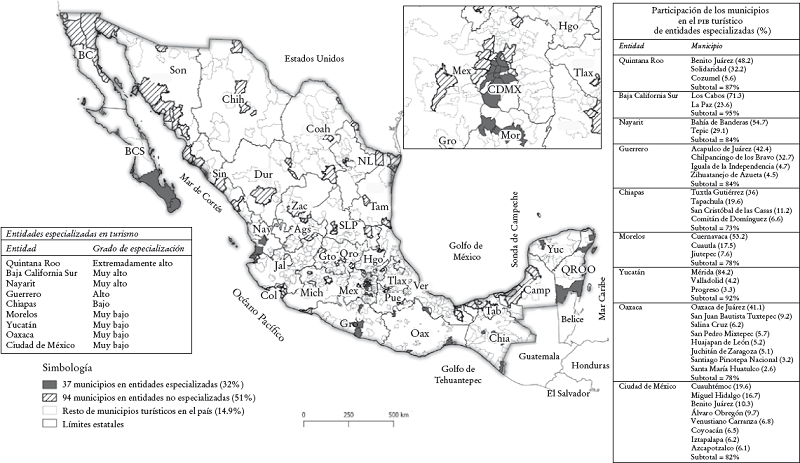 La participación en el PIBTM se localizó en 644 municipios, incluyendo alcaldías, que representaron, para 2018, 97.9% del PIB turístico nacional. No obstante, si se consideran las entidades federativas especializadas en turismo que contribuyeron con 35% del total del PIBTM, los municipios que concentraron casi en su totalidad la actividad turística fueron 37 (véase la Tabla 4). Además, 94 municipios concentraron la mayor parte de las actividades turísticas en aquellas entidades federativas no especializadas en tal sector (véase la Tabla 5). De ahí que a nivel nacional se considera la existencia de 131 municipios que concentraron casi la totalidad de la actividad turística nacional, y que, en términos relativos, corresponden a 5.6% del total de los 2 446 municipios del país en 2018. Con base en lo anterior, puede concluirse que la mayoría de los municipios con actividad turística se caracteriza por su elevada dispersión espacial (véase el Mapa 3).