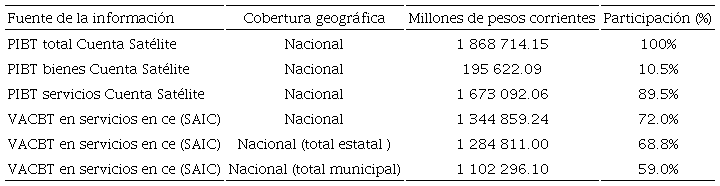 Las diferencias con los datos nacionales surgen, por un lado, de la confidencialidad de los datos, lo que ocasiona que se omita la presentación de información, y, por otro lado, de las estimaciones agregadas de la producción turística, las cuales implican el uso de diferentes fuentes de información estadística, además de la censal, que sólo contiene información del sector privado, lo que arroja diferencias entre ambos valores. Sin embargo, la medición espacial desagregada del turismo debe ser estadísticamente consistente con la nacional. Por ello, dichos datos subnacionales se reexpresaron en términos nacionales, al multiplicar la participación porcentual del valor agregado de los sectores del PIB turístico estatal y municipal por el total nacional, proveniente de la cuenta satélite, con el supuesto de que esas participaciones se mantienen y sólo se reexpresan sus valores al considerar el dato medido nacionalmente como el total.