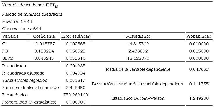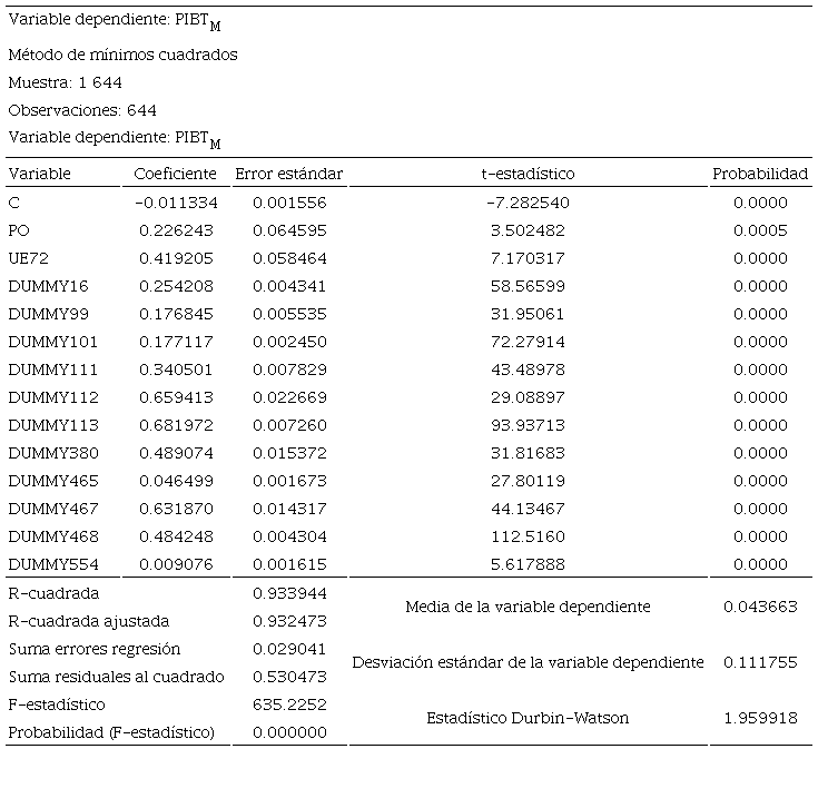 En el Cuadro 5 se muestran los resultados del modelo de regresión ajustado, los cuales confirman la validez de la ecuación de regresión del PIBTM, ya que la R cuadrada ajustada es de 93% y existe significancia estadística en todos los regresores, incluyendo los de las variables dummy, ya que su probabilidad es menor de 0.5% en todos ellos. Por otra parte, el error estándar de la regresión es tan sólo de 0.029041, lo que es indicativo de una menor dispersión. Además, la suma de los cuadrados de los residuos también disminuyó a 0.530473, por lo que mientras menor sea este valor, mejor se ajustará el modelo a los datos. Asimismo, los valores del estadístico F son positivos. Además, el estadístico Durbin-Watson es cercano a dos, lo que indica que no existe autocorrelación.