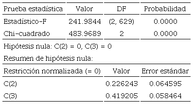 Por último, para determinar si las variables independientes de la regresión, las dicotómicas y las correspondientes a valores establecidos que se presentan en el Cuadro 5 son estadísticamente significativas, se aplicó la prueba de Wald. Los resultados obtenidos se presentan en el Cuadro 6, donde se observa que la probabilidad es menor a 0.05, por lo que se rechaza la hipótesis nula de que los parámetros son iguales a cero y se acepta la hipótesis alternativa, en la que son diferentes de cero y, por lo tanto, son estadísticamente significativos.