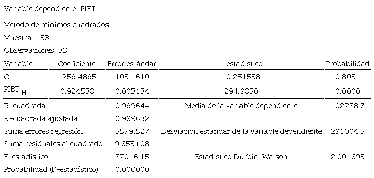 Por último, para validar la significancia estadística de la estimación del PIBTL, se llevó a cabo una prueba de hipótesis. De acuerdo con Guajarati y Porter (2010), una prueba de significancia es un procedimiento que utiliza los resultados muestrales para comprobar la verdad o la falsedad de la hipótesis nula. Esta prueba, aplicada a la asociación entre el PIBTL como variable dependiente y al PIBTM como independiente, con la hipótesis nula plantea que no existe asociación estadística entre ambas. Al respecto, los resultados rechazan la hipótesis nula, lo que da evidencia de la asociación entre las variables consideradas, debido a que los resultados arrojan una R cuadrada de 99% y la probabilidad es menor a 0.5%, como se muestra en el Cuadro 7.