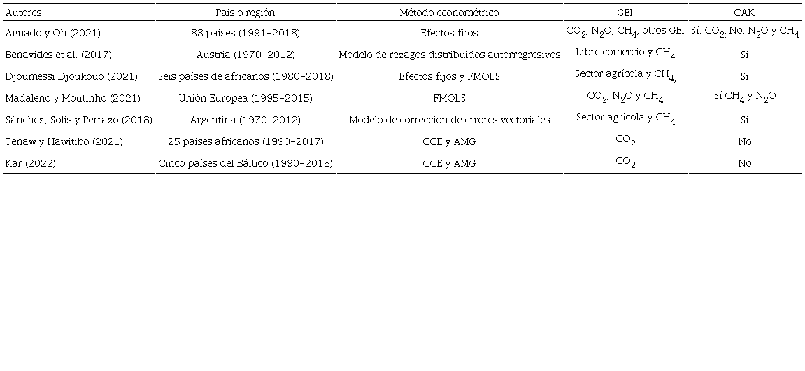 Hasta hoy se ha querido probar la hipótesis de CAK a fin de determinar la relación entre medidas de crecimiento económico, como el PIB con indicadores de contaminación ambiental en suelo, agua y aire (incluyendo GEI) (Benavides, Ovalle, Torres y Vinces, 2017; Aguado y Oh, 2021; Alkhars, Alwahaishi, Fallatah y Kayal, 2022). Las investigaciones han permitido en varios casos encontrar evidencia estadística de una relación en forma de U inversa entre los niveles de emisión de GEI y el crecimiento económico en ciertas regiones del mundo. Algunas investigaciones comprenden emisiones provocadas por el sector agrícola. Un ejemplo de estos estudios se encuentra en el Cuadro 1. Cinco de tales investigaciones han encontrado evidencia de CAK para emisiones de metano y óxido nitroso. Dos de ellas están relacionadas con emisiones de GEI por parte del sector agrícola y una para metano de origen agrícola en Argentina.