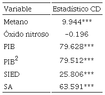 En Cuadro 2 se observa que, a excepción de óxido nitroso, en el resto de las variables involucradas en la estimación de los modelos se rechaza la hipótesis nula de existencia de dependencia transversal débil con un nivel de significancia (en adelante NS) de 0.01.