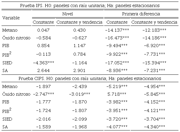 Por lo anterior, este trabajo tiene como objetivo determinar de forma econométrica si hay evidencia estadística que indique la presencia de una CAK en emisiones agrícolas per cápita de metano y óxido nitroso en 26 países latinoamericanos y del Caribe de 1990 a 2019. Para ello se determinan dos funciones por separado: una para cada tipo de gas. Cada función tiene como variable independiente al PIB per cápita y su término cuadrático. Se añaden como variables de control el stock de la inversión extranjera directa (SIED) y la superficie de tierra agrícola. A la función de óxido nitroso se incorporaron también como variables de control las emisiones agrícolas de metano, como se hace en otras investigaciones (Gómez, Cerquera y Acero, 2021). A las variables de cada función se les probó primero la presencia de raíces unitarias en el nivel y su estacionariedad en diferencias.
