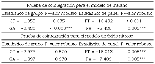 Ante la presencia de variables integradas de primer orden I(1), se determinó si existe evidencia estadística de cointegración en las variables que constituirán los modelos de emisiones de cada gas con una H0 de no cointegración, respectivamente. Esto es, de existir cointegración puede asumirse una relación de equilibro de largo plazo, que es una combinación lineal de las variables que es estacionaria (Barreto Nieto y Campo Robledo, 2012). Para ello, se aplicó la prueba de Westerlund de segunda generación para paneles heterogéneos (robusta ante dependencia transversal) (Persyn y Westerlund, 2008).
