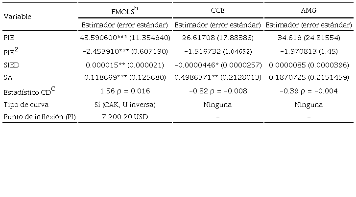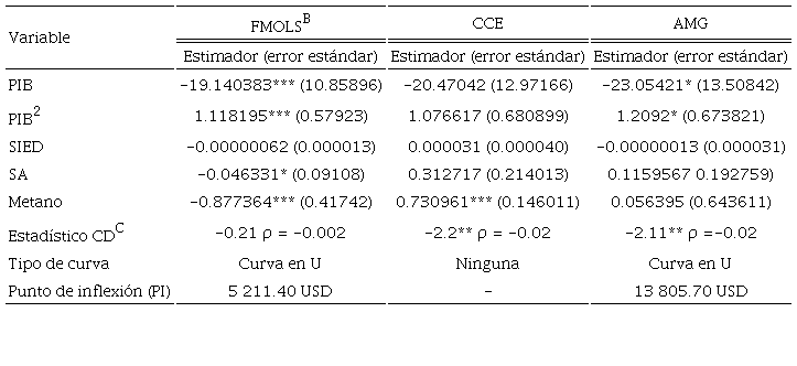 A fin de estimar los coeficientes de largo plazo y probar estadísticamente las hipótesis de CAK y del paraíso o halo contaminante, se estimaron las ecuaciones (3) y (4) mediante FMOLS, CCE y AMG.