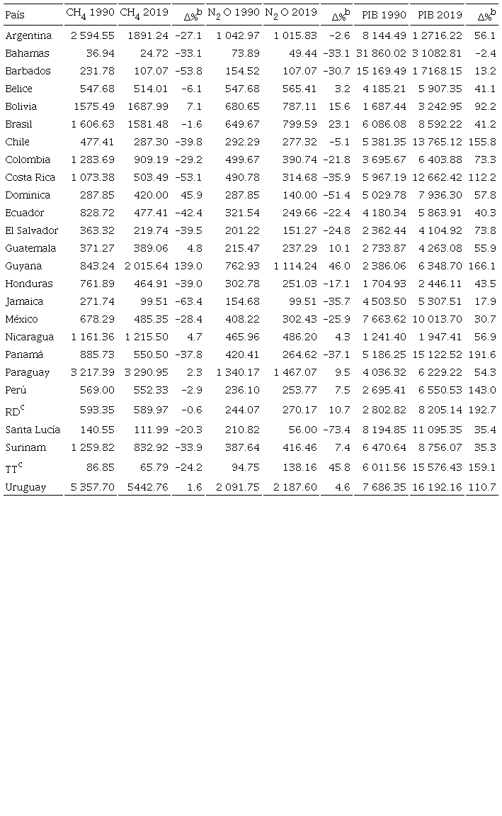 A fin de realizar la prueba de la hipótesis de la curva ambiental de Kuznets sobre metano y óxido nitroso en países de América Latina y el Caribe, se ordenó una base de datos con información del Banco Mundial (2022), la cual se recabó para 26 países de la región de 1990 a 2019. Los países se seleccionaron con base en la información existente. Los datos recabados de Banco Mundial (2022) para obtener las variables fueron: