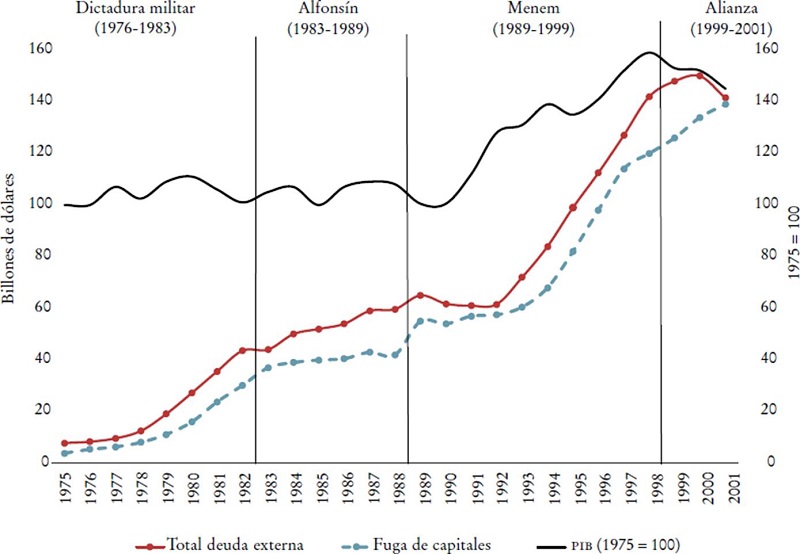 En la Gráfica 1 podemos apreciar la evolución del endeudamiento llevado adelante por Argentina entre 1976 y 2001, así como la evolución del PIB y la fuga de capitales.