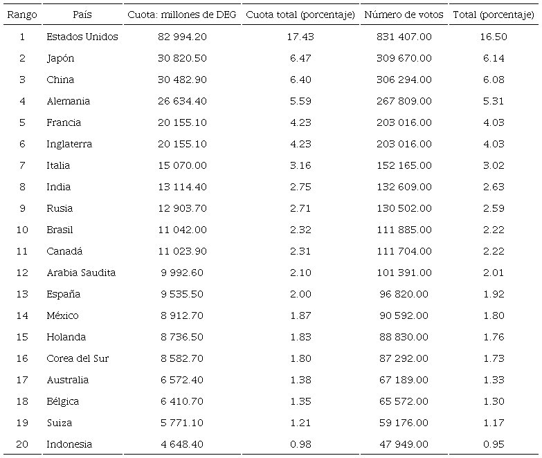 Es importante remarcar que, de acuerdo con la contribución de los diferentes países, se generan distintas cuotas para cada miembro, que en términos generales reflejan el tamaño y la posición relativa de los países en la economía mundial, así como el poder de éstos dentro de la organización. El FMI realiza regularmente revisiones generales de cuotas, la última (la decimocuarta) concluyó en 2010 y los aumentos de cuotas se hicieron efectivos en 2016. En el Cuadro 1 podemos ver el peso de las principales 20 economías del mundo, la contribución en millones de DEG y la participación de sus cuotas, con base en las cuotas realmente pagadas hasta 2024.