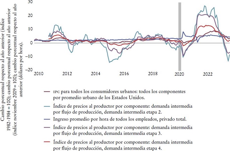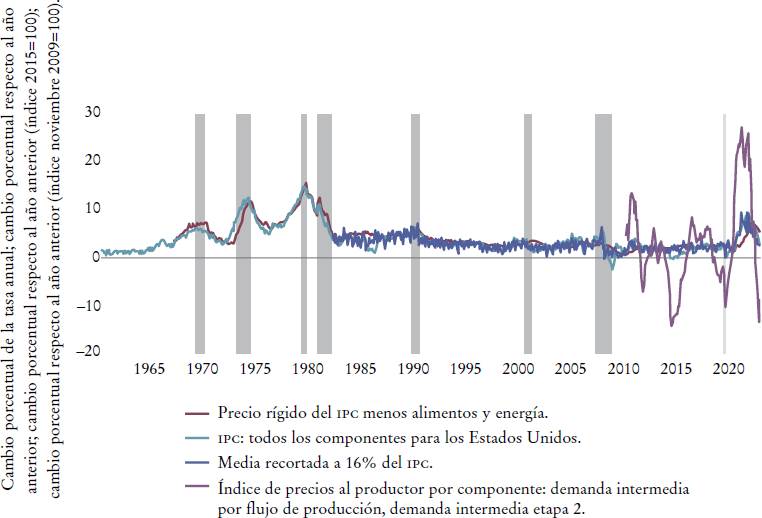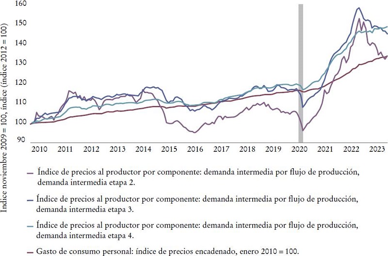 El reciente episodio inflacionario ha suscitado un considerable debate público y científico. Gran parte de éste se ha dado en redes sociales como X (antes Twitter), pero también en numerosos artículos científicos ya publicados que se centran únicamente en un subconjunto de precios, agregados en el índice de precios al consumidor (IPC).1 O incluso en subconjuntos más limitados de precios de este índice, como los “precios subyacentes” -precios al consumidor que excluyen los precios de los alimentos y la energía-, la “media recortada” de los precios -un índice que “excluye 8% de los componentes del IPC con los cambios de precios mensuales más altos y más bajos en cada cola de la distribución de los cambios en los precios” (Federal Reserve Economic Data [FRED], 2023)-, entre otros. Esto es digno de notarse, ya que se supone que la inflación es un proceso que afecta toda la economía monetaria, no sólo el gasto de los consumidores. En lugar de centrarse en un subconjunto de un subconjunto de precios o, como en los “precios súper subyacentes”, en un subconjunto de un subconjunto de un subconjunto, hacerlo en más precios y otros subconjuntos podría brindar información adicional. La Gráfica 1 muestra, por un lado, las grandes diferencias entre los distintos subconjuntos del IPC ya mencionados, y, por otro, uno de los índices de precios al productor o, en el lenguaje de las cuentas nacionales, “consumo intermedio”. La gráfica presenta los llamados precios al productor de la “etapa 2”.2 Éstos son conceptualizados, estimados y publicados por la Oficina de Estadísticas Laborales (BLS, por sus siglas en inglés) de los Estados Unidos, a fin de obtener una visión más clara de la inflación “inducida por el alza de costos”. Volveré a esto. En este momento es importante señalar que existen grandes diferencias: en el momento de escribir este artículo, la inflación de los precios al consumidor en los Estados Unidos todavía era positiva, ¡pero los precios al productor de la “etapa 2” mostraban una deflación de 10 por ciento!