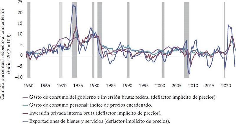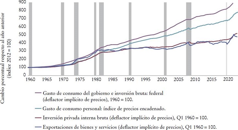 En lo que respecta a la inflación del gasto final, existen bastantes diferencias en las tendencias. En los Estados Unidos resulta que a largo plazo los precios de las exportaciones y de la inversión fija empresarial aumentaron mucho menos que los precios al consumidor, lo que significa que la inflación de estos últimos afectó de sobremanera la inflación del gasto total. Sin embargo, durante el reciente episodio de inflación, todos los precios del gasto se incrementaron.
