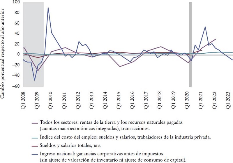 A fin de estimar la inflación de los ingresos, se ha elaborado una Gráfica (6) de los cambios en los salarios totales, las ganancias y las rentas de la “tierra y los recursos naturales”; habrá en alguna medida una doble contabilización entre las ganancias totales y las rentas de la “tierra y los recursos naturales”; por cuestiones de espacio, no tomaré en cuenta los ingresos por intereses. He optado por considerar los totales, ya que la ganancia no tiene un “precio”; no existe una unidad natural de ganancia como el salario por hora o por persona y la renta por hectárea por año. Para hacer comparaciones, agregué los salarios por hora; las diferencias entre los salarios por hora y los salarios totales son causadas por aumentos y disminuciones en el empleo y las horas trabajadas. Si se analiza el reciente episodio inflacionario, queda claro que el aumento del ingreso total que, por necesidad contable, tuvo que producirse, se distribuyó, en un sentido relativo, de manera desproporcionada en un inusual incremento concomitante en las ganancias y las rentas de la “tierra y los recursos naturales”, incluso cuando los salarios totales también mostraron un aumento inusualmente fuerte.