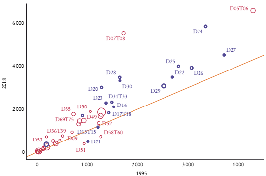Adicionalmente, es relevante observar cómo cambian los índices al comparar el inicio con el final del periodo. Para el índice de participación de vínculos hacia adelante (insumos del país en terceros países), entre 1995 y 2018 en promedio los sectores registraron incrementos de 5.8 puntos porcentuales, y, si se distingue entre sectores manufactureros y no manufactureros, en los primeros el incremento fue de 8.9 puntos porcentuales y en los segundos, de 4. La Gráfica 4 muestra que en la mayoría de los sectores se incrementó este indicador, lo que señala que en éstos tienden a predominar las exportaciones de bienes primarios o intensivos en recursos naturales, o son importantes proveedores de materias primas y componentes o bienes intermedios. Esto se corrobora al listar los 10 sectores con mayores incrementos en el indicador GVCPtf: desde D07T08, explotación de minas y canteras, productos no energéticos (38.1 puntos porcentuales), hasta D26, equipos informáticos, electrónicos y ópticos (8.5 puntos porcentuales).