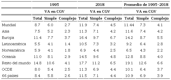 El avance de las CGV en el mundo se observa en todos los grupos de países y regiones considerados, de ahí que el VA no relacionado con el comercio internacional ha perdido participación, mientras que aquel relacionado con el comercio y la producción globales se ha incrementado. Las manufacturas destacan por la caída del VA doméstico, ha descendido de 57% en 1995 a 40% en 2018. Mientras que los otros componentes del VA se han incrementado de 20.2 a 27.9% para el VA incorporado en las exportaciones finales; de 15 a 18.6% en CGV de actividades simples, y de 7.7 a 13.4% en el VA en CGV complejas; esto es, en 2018, 32% del VA se asociaba con CGV.