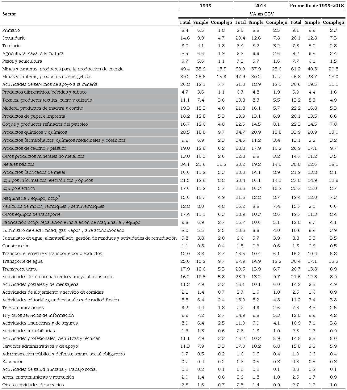 De igual forma, la descomposición de la Y muestra que la parte de la producción y el comercio de bienes finales relacionada con las CGV se ha incrementado. Desde la Y se distingue que en las manufacturas el contenido relacionado con las CGV proviene predominantemente de actividades simples, pero las complejas o que cruzan fronteras más de una vez tienen una importancia similar (11.4 y 10.3%, respectivamente). Los resultados muestran que en el sector secundario (-6.7 puntos porcentuales) y el manufacturero (-9.9 puntos porcentuales) el VA doméstico en productos finales de uso nacional o doméstico (no relacionado con el comercio internacional) tiene los mayores descensos entre 1995 y 2018, aspecto que se compensa con alzas en el contenido relacionado con las exportaciones finales y las actividades vinculadas con las CGV.
