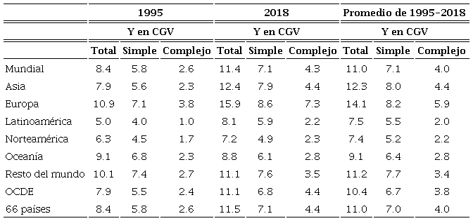 Como se muestra en el Cuadro 3, la Y asociada a CGV se ha incrementado. En el mundo el cambio fue de 8.4 a 11.4% o tres puntos porcentuales. Europa (10.9 a 15.9%) y Asia (7.9 a 12.4%) son las regiones en las que se registró el mayor cambio en este rubro. De hecho, en todas las regiones consideradas, salvo Oceanía, aumentó, y en Asia y Latinoamérica ese cambio se debe en mayor parte a actividades de tipo complejo. De esta manera, el avance de la producción segmentada internacional también se observa desde la Y.