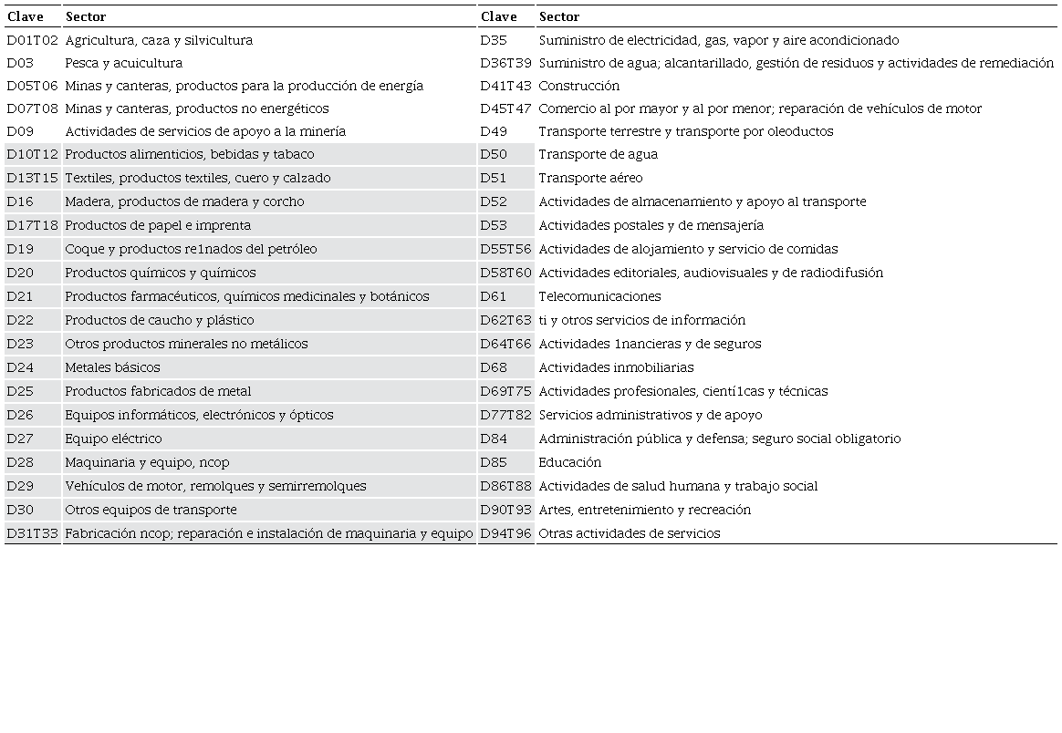 Para el primer punto, se sigue la propuesta metodológica desarrollada por Wang et al. (2017a), la cual se adapta a las ICIO, que consideran 66 países y el “resto del mundo”, e incluyen 45 sectores de actividad (véase la descripción en el Cuadro 1A del apéndice). Una característica adicional es que México y China tienen matrices de insumo-producto (MIP) que se desagregan de acuerdo con el tipo de producción que realizan, la cual se denomina normal o procesamiento (maquila). Es importante destacar que en la actualidad existen diversos esfuerzos que generan MIP mundiales. En este trabajo se aprovecha que las ICIO cubren un periodo amplio, reciente y desagregado por sectores, en comparación con otras fuentes. Por ejemplo, las matrices multirregionales del Banco Asiático de Desarrollo (ADB) tienen versiones desde el 2000 hasta 2022, pero su nivel de desagregación sectorial es de sólo 35 sectores.