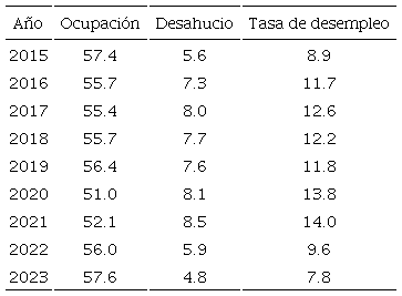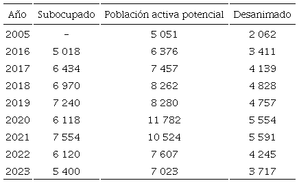 El empeoramiento de las condiciones laborales desde 2015 también queda patente al analizar los datos de las distintas medidas de subutilización de la mano de obra. Al igual que el número de desempleados, el número de trabajadores subempleados alcanzó su máximo en 2021, y descendió a partir de ese año, pero llegó a 2023 sin alcanzar los niveles de 2016. En una línea similar, también se observa una expansión de la población activa potencial, que alcanzó su punto más alto en 2020: más de 11 millones de personas, de las cuales casi la mitad eran trabajadores desanimados, cuyo nivel se duplicó con creces en el mismo periodo.8 Incluso cuando excluimos los años que ya tuvieron los efectos de la pandemia, las cifras siguen siendo significativas, con un aumento de más de 2 millones de trabajadores subempleados en 2019, más de 5 millones en la fuerza laboral potencial, y de éstos más de 3 millones desalentados en 2020. Lo que formalmente se produce es una expansión de estos últimos como proporción de la población activa potencial: si en 2015 representaban 40.81%, y eran 47.14% en 2020, el indicador alcanza su punto más alto en 2023, al llegar a 52.92%. Aunque todos estos indicadores muestren un descenso a partir de 2023 y alcancen ya niveles inferiores a los de antes de la pandemia, lo cierto es que siguen expresando el alto nivel de vulnerabilidad de las relaciones laborales, sobre todo cuando se observa el aumento del número de trabajadores desanimados, que representan más de 5% de la población activa y todavía representarán 3.3% en 2023. La información puede verse en los Cuadro 3 y 4.