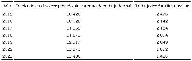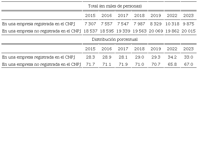 Las dos principales variables analizadas en este texto serán “personas de 14 años y más empleadas en la semana de referencia, por situación de informalidad en el empleo principal” (IBGE, 2023a) y “tasa de informalidad de las personas de 14 años y más empleadas en la semana de referencia” (IBGE, 2023b). La situación de informalidad se refiere a las personas ocupadas como “asalariado del sector privado, excluido el trabajador doméstico, sin permiso de trabajo firmado”, “trabajador doméstico, sin permiso de trabajo firmado”, “empleador sin CNPJ [registro nacional de personas jurídicas, por sus siglas en portugués]”, “por cuenta propia sin CNPJ” y “trabajador familiar auxiliar en el empleo principal”. La tasa de informalidad se calcula en relación con el número total de trabajadores empleados. Los datos están disponibles de 2016 a 2023 y son acumulados a partir de las primeras visitas, excepto para 2020-2022, que se recogen a partir de las quintas visitas, debido a la pandemia de covid-19.