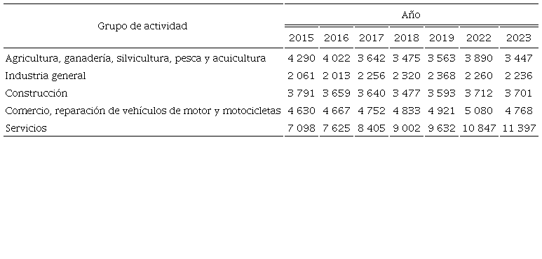 Finalmente, con el objeto de identificar a los trabajadores informales por sector, el Cuadro 9 presenta informaciones sobre el número de trabajadores por cuenta propia por grupo de actividad. Aquí no hay separación entre trabajadores con y sin registro en el CNPJ, pero la información proporcionada por la PNAD Contínua muestra que del total de trabajadores por cuenta propia 18.4% estaba registrado y 81.6% no lo estaba en 2015; en 2023 cambian los porcentajes a 24.9 y 75.1%, respectivamente. Así, debido a que la mayor proporción de trabajadores autónomos no está registrada, es posible indicar, a partir del análisis del total, la concentración sectorial de los trabajadores informales. Los trabajadores por cuenta propia se concentran en gran medida en el sector servicios, que representaba 32.5% del total en 2015, cifra que aumentó hasta 44.6% en 2023. Considerando conjuntamente a los trabajadores de los sectores de servicios y comercio, reparación de vehículos de motor y motocicletas, los totales eran de 53.6 y 63.3%, respectivamente. De forma aislada, todos los demás sectores han reducido su cuota del total de trabajadores por cuenta propia.