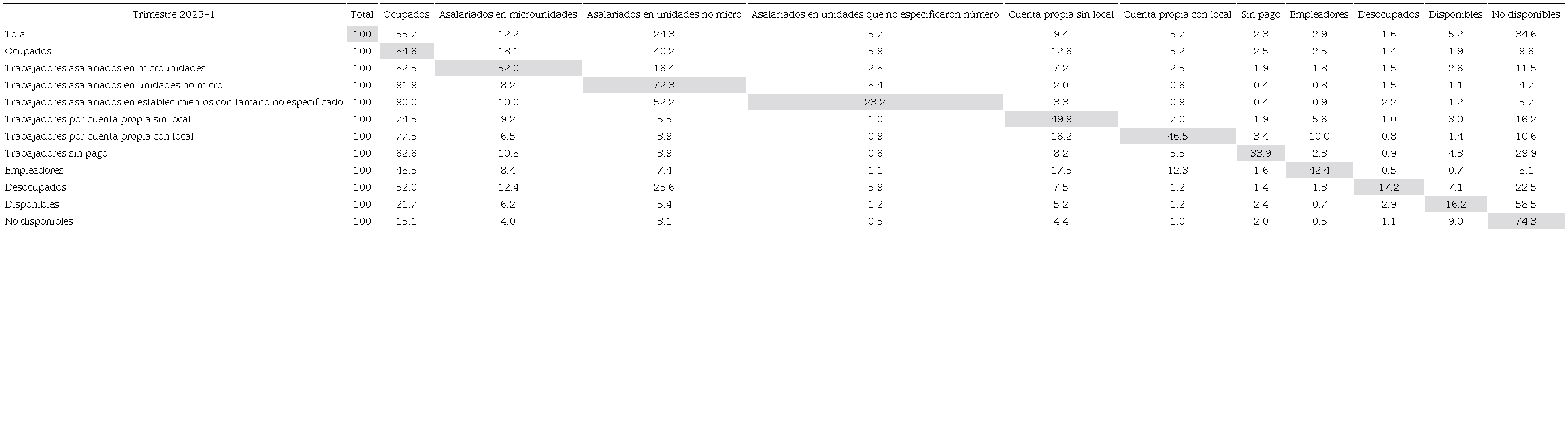 Para este fin usaremos la matriz de flujos entre el primero y el segundo trimestres de 2023 de la Encuesta Nacional de Ocupación y Empleo (ENOE) del Instituto Nacional de Estadística, Geografía e Informática (INEGI) de México.7 Usaremos las categorías de ocupados, desocupados e inactivos, dividimos la categoría de ocupados entre asalariados en unidades micro y no micro; trabajadores por cuenta propia entre quienes tienen un establecimiento fijo y quienes no; los trabajadores por cuenta propia y los empleadores. A las personas en condiciones de no actividad económica las distinguimos según su declaración de estar o no disponibles para trabajar si se les ofreciera un empleo. Los resultados aparecen en el Cuadro 1.