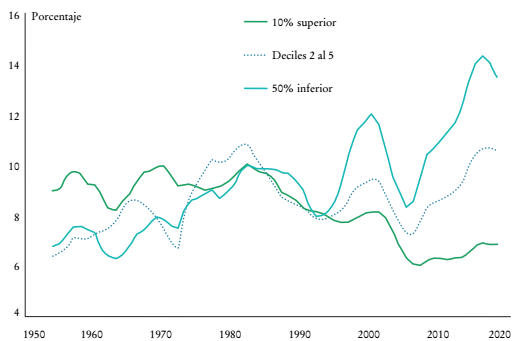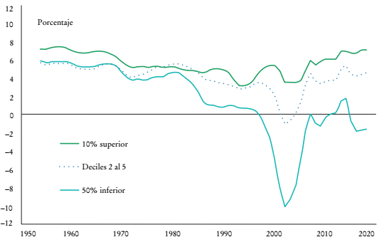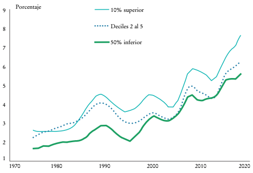 La Gráfica 4 muestra la evolución del margen de beneficios. Para el 10% que cubre a las corporaciones de mayor tamaño, luego de un leve descenso, se observa una recuperación a lo largo del siglo XXI. En contraste, el 50% integrado por las corporaciones de menor tamaño ve caer muy fuertemente sus márgenes de beneficio. Y, como han elevado los pagos a accionistas y también aumentan sus inversiones de capital, caen en una condición de endeudamiento más que peligrosa. Es decir, resultan muy propensas a las quiebras, situación que con el impacto de la pandemia de covid-19 se tiene que haber acentuado.9 En suma, la desigualdad extrema no sólo es la que se observa entre capitalistas y trabajadores, también se manifiesta en el interior de la clase capitalista.