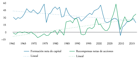 Un segundo dato muy relacionado (Gráfica 2) se refiere a la relación entre los gastos aplicados a la inversión neta (de capital fijo) y la recompra neta de acciones. En los dos casos el rubro se maneja como porcentaje del excedente neto de operación. Los indicadores se pueden considerar expresión de la preferencia entre inversiones reales y financieras por parte de las empresas (que son no financieras) que ejecutan dicha opción. La primera relación, que es clave para el crecimiento de la empresa, desciende fuertemente entre 1960 y 2015. Entretanto, la recompra de acciones (que es otro tipo de uso, de carácter financiero) se eleva fuertemente como porcentaje del excedente neto. Que la dimensión financiera suba tanto y la real descienda es un claro síntoma de lo que ha venido sucediendo en el último medio siglo.