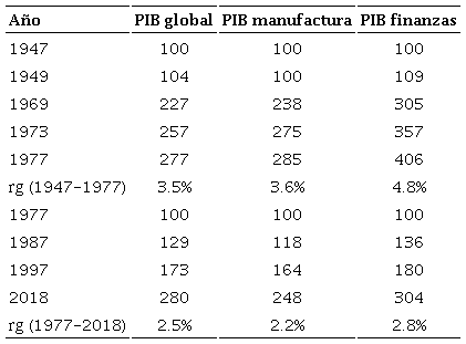 En el Cuadro 2 se distinguen dos periodos. El inicial va de la posguerra a 1977; es una fase de alto crecimiento cuando la manufactura se acompasa al crecimiento del PIB y lo supera levemente, y el sector financiero supera ampliamente al crecimiento del PIB global y del manufacturero. El segundo periodo cubre 1977-2018; en él el ritmo de crecimiento baja fuertemente, el global llega a 2.5% y la manufactura cae aún más, al crecer a 2.2% anual. El sector financiero también desciende, pero sigue creciendo por encima de los otros.