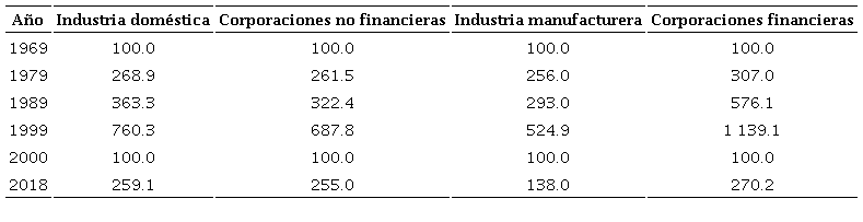 Otro dato que llama la atención es el brutal descenso de la participación de las ganancias de la industria manufacturera, la cual pasó de casi 46% en 1969 a un bajísimo 14.1% en 2018. En 1969 las ganancias en el sector manufacturero eran tres veces mayores a las que conseguía el de finanzas; en 2018 finanzas tenía 1.4 veces más ganancias que la industria manufacturera.