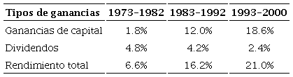 Sentado lo anterior, tenemos que en la rentabilidad del capital accionario conviene distinguir la porción que opera como utilidades distribuidas y la que funciona como “ganancias de capital”. En los Estados Unidos, durante los últimos años la evolución ha sido como muestra el Cuadro 7.