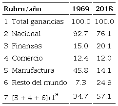 En el cuadro, junto al sector financiero colocamos el sector de comercio (mayorista y minorista). Con ello obtenemos una primera, muy gruesa y subvaluada estimación del sector improductivo: faltan algunos rubros de servicios y los gastos improductivos (publicidad, seguridad, etc.) que operan en el interior de las empresas industriales. Con todo, podemos ver que estos segmentos pasan de apropiarse de 27.4% de las ganancias totales en 1969, a 32.1% en 2018. El rubro que aquí sube es el de finanzas: desde 15% en 1969 hasta 20.1% en 2018. Un aumento fuerte, de 33 por ciento.